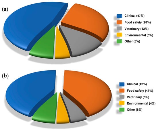 Excluding the articles mainly focused on the technical improvements (298) and unifying in the category “other” the applications related to agriculture, industrial, forensic and other (e.g., biotechnology, cultural heritage, etc.), the breakdown by LFIA application is reported in Figure 5a. As expected, in the considered 10-year period, the clinical application accounted for the majority of the total LFIA applications (almost half), followed by food safety, veterinary and environmental.