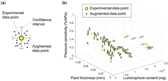 (a) Schematic concept of data augmentation by newly produced data points (augmented data points) from experimental data points using confidence intervals based on the experimental errors. (b) An example of data augmentation: 100 augmented data points, DA,7600, were created around each experimental data point, and a total of 76 × 100 was produced as output for pressure sensitivity for different paint thicknesses and luminophore contents as inputs.