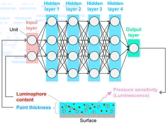 The higher pressure sensitivity is obtained by adjusting the paint formulation of the PSP. The luminophore concentration of the PSP influences the pressure sensitivity [,,]. Other components such as the thickness of the PSP applied to a surface also affect the pressure sensitivity [,,,]. The pressure sensitivity of the PSP is determined by an experimental calibration. Typically, one component of a PSP is varied at a time to extract the correlation between the component and pressure sensitivity. Depending on the range of required pressure sensitivity, an extensive range of the components sensitive to pressure sensitivity must be experimentally investigated. Such investigations require significant time since many experimental coupons must be created and calibrated. Ideally, all components must be investigated, including their mutual interactions, in order to map their influence on the pressure sensitivity of the PSP. Given the complex nature of the correlations between the pressure sensitivity and components, it is challenging to incorporate all of the components into a parametric study due to experimental time constraints. It is highly desirable to create a model linking the pressure sensitivity and components related to the PSP. In this work, we investigate the use of artificial neural networks (ANNs) to create the model.