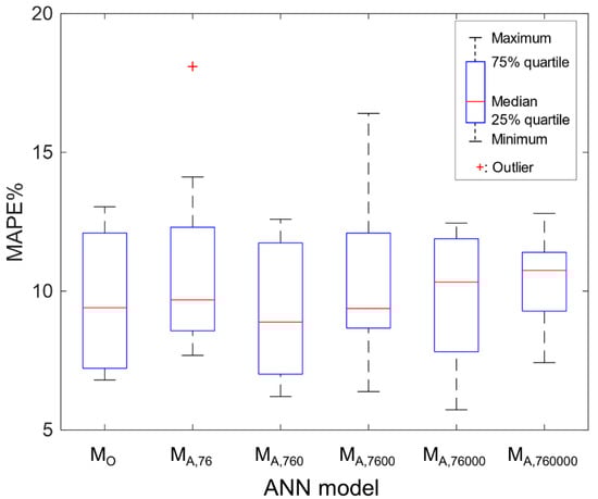 Figure 3 shows the comparison of the MAPE obtained in testing for different ANN models. All models use the same architecture (i.e., the size of layer and unit is the same for all models). However, each model was trained using a different training dataset, as shown in Table 2, and MAPE was computed in the testing phase. The procedure of obtaining the MAPE (for example, MA,760, shown in Figure 3) is as follows: (1) the architecture is trained using a training dataset of 760 points; (2) prediction is obtained using the test data of 8 points; (3) MAPE is computed; (4) step (1) to (3) is repeated 10 times. Maximum, minimum, 75% quartile, 25% quartile, and median of MAPE are presented in the boxplot. MAPE is a measure of the mean of the absolute error relative to the test datasets. MAPE scales the overall accuracy of the prediction through the entire domain. The lower the MAPE values, the higher the accuracy of the prediction. MA,760 showed the lowest median MAPE of 8.9% in ANN models using the augmented datasets. As the number of augmented data points increased, the median MAPE increased where larger augmented data points than M A,760 were used, as shown in MA,7600, MA,76000, and MA,760000. By comparing all MA,n models trained by using augmented datasets, it was found that the number of augmented data points influences the MAPE. It was also found that an investigation of the effect of the number of augmented points is required to minimize the MAPE. MO showed a median MAPE of 9.4%, which was larger than that of the MAPE of 8.9% for MA,760. By comparing MO with all MA,n models, it is found that the use of augmented datasets minimizes the MAPE more than that of MO. The augmentation achieved greater accuracy. In the present study, the augmented data set consisting of 760 points is considered sufficient to lower the MAPE in the testing.