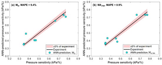 Prediction accuracy of MO and MA,760 models for the test dataset. The shaded area enclosed with a dashed line indicates the confidence interval of ±5% of the experimental measurement. (a) The model MO, trained by DO,76. Four of eight test points were within 5% of the experimental measurement and MAPE was 9.4%. (b) The model MA,760, trained by augmented dataset, DA,760. Four of eight test points were within 5% of the experimental measurement and MAPE was 8.9%. The figure indicates that both models predict the pressure sensitivity within ±5% of the experimental measurement.