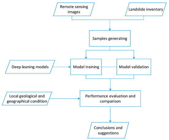 The flowchart of this study is shown in Figure 2. First, samples were generated from remote sensing images with landslide polygons; then, typical deep leaning models (e.g., VGG neural networks (VGG), residual networks (ResNet), densely connected networks (DenseNet), and U-Net) with different structures and layer numbers were trained and validated with three sample sets (S100, S1000, and S10000), and then their performances were evaluated and compared; finally, suggestions for further study and projects were given.