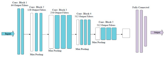 Previous studies proved that multiple small convolution kernels could enhance the feature learning ability of the model. It is easy to obtain deeper and more abstract features with a VGG model [25]. Moreover, VGG has strong generalization ability. A trained VGG model could be smoothly used in other images, and achieved good performance. Typical VGG models—VGG16, and VGG19—were tested in this study, as they have shown outstanding performance in many related studies [40]. VGG16 consists of 13 convolutional layers and 3 fully connected layers, while VGG19 has 16 convolutional layers and 3 fully connected layers.
