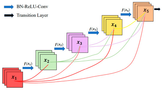 In the DenseNet proposed by [42], all layers connect with one another, in order to ensure that information can be transmitted between layers (as shown in Figure 5). DenseNet consists of dense blocks and transition layers; two adjacent dense blocks are connected by a transition layer, which includes a 1 × 1 convolutional layer and a 2 × 2 average pooling layer. Feature maps and gradients can be effectively transmitted between dense blocks through transition layers. Then, gradient loss can be easily avoided in this model, as each layer can directly get the input information and loss function.