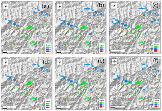 Detection results of scene-oriented models with sample set S10000 around the Daguangbao landslide (the central one) in the Wenchuan earthquake area: (a) VGG16; (b) ResNet50; (c) DenseNet120; (d) VGG19; (e) ResNet101; (f) DenseNet201. The Daguangbao landslide is known for its area (7.11 km2) and height difference (1567 m) [46]. Here, landslides correctly detected (TP) or missed (FN) are shown in the form of polygons, while scenes misidentified as landslides (FP) are shown in blue rectangles. The blurred patch in the southwest is a defect of the original DEM, not related to the detection result.