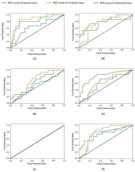 ROC curves of each class for model: Inception–learning rates (a) 0.001, (b) 0.01, and (c) 0.1; ResNet–learning rates (d) 0.001, (e) 0.01, and (f) 0.1. Normal class in blue, incipient in orange, and advanced in green.