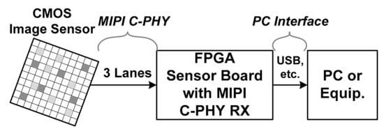 In recent years, high performance in frame rate, color depth and image resolution is constantly required for mobile CMOS image sensors (CISs) [,,,]. In accordance with this requirement, the mobile industry processor interface (MIPI) C-PHY protocol, along with the MIPI D-PHY protocol, has been studied and reported to increase the interface bandwidth [,,,,]. The MIPI C-PHY uses a three-phase symbol with an embedded clock and transmits a three-level signal through three wires per lane. Because of this, unlike the MIPI D-PHY, it does not transmit an additional clock even at high symbol rates, thereby reducing power consumption. The MIPI C-PHY version 1.1 specification supports a symbol rate of 3.0 Gsymbol/s/lane for each lane. It has a total data rate of 20.52 Gb/s when three lanes are used. This value is approximately equal to the total bandwidth when each of the four data lanes of the MIPI D-PHY has a data rate of 5.0 Gb/s/lane. The MIPI C-PHY is mainly used in the short channel between the CIS and the application processor. However, it is necessary that the MIPI C-PHY also support heavy channels for applications such as field-programmable gate array (FPGA)-based frame grabbers used to evaluate CISs, as shown in Figure 1. As the symbol rate or channel loss increases, the signal integrity of the MIPI C-PHY using a three-level signal can be further degraded due to level-dependent inter-symbol interference (ISI) [].