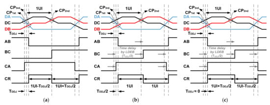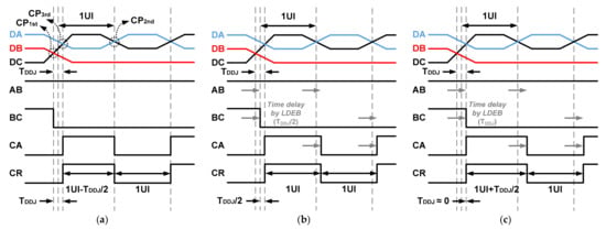 Figure 3 shows time diagrams to illustrate the operation of the high-speed receiver using the LDEB for the MIPI C-PHY. The signals DA, DB, and DC refer to the three-level signals transmitted from the MIPI C-PHY transmitter. Meanwhile, the signals AB, BC, CA, and CR represent the data and clock signals received and recovered in the MIPI C-PHY receiver. The signals AB, BC, and CA are generated by comparing the voltage differences between DA and DB, DB and DC, and DC and DA. Furthermore, the clock signal CR is recovered by the transitions of the three received data AB, BC, and CA. In particular, when two or three transitions among the three received data occur, the clock signal CR is recovered by the last transition of the three received data, as shown in Figure 3a. Since common mode voltages of the input signals DA, DB, and DC for the high-speed receiver are different from each other, the cross point of the two input signals may be different depending on the voltage level of the input signal; this can generate time jitters of the received data and recovered clock, as shown in Figure 3a. When the cross points are generated at CP1st and CP3rd due to the transitions of three signals with different voltage levels, the time jitters of the received data and recovered clock are generated as the values of TDDJ and TDDJ/2, respectively. In this case, time-domain equalization using the LDEB improves the signal integrity from the level-dependent ISI. Figure 3b shows this by applying the LDEB to the signals BC and CA, upon which the time jitter of the received data is reduced to TDDJ/2 and the recovered clock, CR, does not ideally contain a time jitter due to the level-dependent ISI. However, as shown in Figure 3c, when excessive delay time is applied to the LDEB, the time jitters of the received data and recovered clock rather increase. Therefore, optimization of the delay time of the LDEB to TDDJ/2 is required in the case of Figure 3. Furthermore, the optimal delay time of the LDEB changes according to the loss of the channel. The designed delay time of the LDEB may also not be optimized due to variations in the process, voltage and temperature.