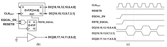 Figure 5 shows the block and time diagrams of the pre-determined data generator used in the MIPI C-PHY transmitter chip for the proposed adaptive level-dependent equalization. The output of the pre-determined data generator, DC[20:0], is supplied to the MIPI C-PHY transmitter instead of the normal data, DP[20:0], to generate the pre-determined data shown in Figure 4 during performing the proposed adaptive level-dependent equalization, as shown in Figure 5a. The signal DC[20:0] is converted to the signals DA, DB, and DC, which are the pre-determined data transmitted through the MIPI C-PHY transmitter for the proposed adaptive level-dependent equalization. The pre-determined data generator shown in Figure 5b is designed by using toggle flip-flops. It begins to generate the signal DC[20:0] after the signal EQCAL_EN, which activates the proposed adaptive level-dependent equalization, becomes high. Figure 5c shows the time diagram of the signal DC[20:0] generated in the pre-determined data generator. The signals DC[18,16,12,10,6,4,0] and DC[19,15,13,9,7,3,1] are the opposite data and have a toggle pattern synchronized with the clock signal CLKDIV7, where the signal CLKDIV7 is a frame clock for supplying 21-bit parallel data to the MIPI C-PHY Transmitter. The DC[20,17,14,11,8,5,2] are signals with a low level. The block MIPI C-PHY Transmitter is implemented by using circuits reported in previous literature [].
