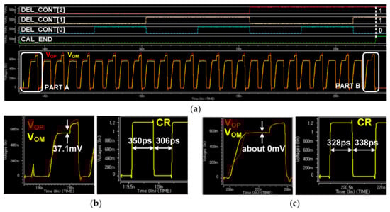 Figure 11 shows the simulation results for the operation of the ALDE when the pre-determined data shown in Figure 4 are supplied to the MIPI C-PHY receiver for the proposed adaptive level-dependent equalization. This simulation was performed at a symbol rate of 3 Gsymbol/s/lane while using transmitter and receiver circuits that support the MIPI C-PHY V1.1 specification. In addition, the pre-determined data generated by the MIPI C-PHY transmitter was transmitted to the MIPI C-PHY receiver through an 80 cm-long FR-4 channel. As the proposed adaptive level-dependent equalization was performed, the output code of the DDTJC, DEL_CONT[2:0], was increased to converge the differential output voltage of the current integrator to zero, as shown in Figure 11a. Actually, Figs. 11b and c show that the differential output voltage of the current integrator decreased from +37.1 mV in PART A to approximately 0 mV in PART B. Furthermore, the duty cycle ratio of the recovered clock CR improved from 53.35% to 49.25%.