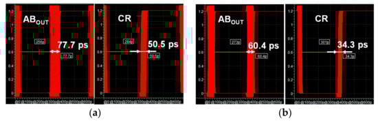 The proposed ALDE was evaluated through simulation for arbitrary input data that met the MIPI C-PHY V1.1 specification. This improved the peak-to-peak time jitters of the received data ABOUT and recovered clock CR from 77.7 ps and 50.5 ps to 60.4 ps and 34.3 ps, respectively, as shown in Figure 12. This simulation was also performed under the same conditions as the simulation in Figure 11.