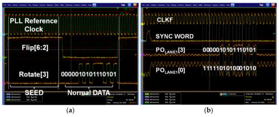 Figure 14 shows the test environment for evaluation of the implemented MIPI C-PHY receiver chip. First of all, the pattern generator supplied the Flip[6:0], Rotate[6:0], and Polarity[6:0] to the MIPI C-PHY transmitter board so that the MIPI C-PHY transmitter chip generated MIPI C-PHY signals with three voltage levels. Actually, the MIPI C-PHY transmitter and PLL implemented in the MIPI C-PHY receiver chip were operated as the MIPI C-PHY transmitter chip on the MIPI C-PHY transmitter board. The MIPI C-PHY transmitter chip supplied the data for normal operation and the pre-determined data for the optimization of the adaptive level-dependent equalization to the proposed MIPI receiver test board. The function of the implemented MIPI C-PHY receiver chip was verified by measuring the synchronization word generated from the reception of the seed word and by comparing the parallel input data of the MIPI C-PHY transmitter board and the parallel output data of the MIPI C-PHY receiver board. According to the MIPI C-PHY specification V1.1, the synchronous word is generated when the Flip[6:0], Rotate[6:0], and Polarity[6:0] are 7b’0111110, 7b’1xxxxx1, and 7b’1xxxxx1, respectively, where “x” means “do not care”. Furthermore, the POLANE#[16:0] is determined as [1, 1, 0, 0, 1, 0, ro6, po6, ro5, po5, ro4, po4, ro3, po3, ro0, po0] by the mapper and de-mapper of the MIPI C-PHY when the POLANE#[16:0] is between 0xc800 to 0xcbff and the Flip[6:0] is 7b’0000110. Figure 15a shows the signals transmitted by the MIPI C-PHY transmitter chip for functional evaluation of the MIPI C-PHY receiver chip. The synchronization word in the MIPI C-PHY receiver chip was activated with all data of the Flip[6:2] set to high. The data streams of the Rotate[3] and Polarity[0], 0000010101110101 and 1111101010001010, were acquired as the signals of the POLANE1[3] and POLANE1[0], respectively, as shown in Figure 15b. Furthermore, the operation of the frame clock generator that generates the clock CLKF through frequency division of 3.5 from the recovered clock was also verified by measuring the frequency of the clock CLKF. When this experiment was performed at an symbol rate of 3.0 Gsymbol/s, the measured frequency of the clock CLKF was 428.571 MHz.