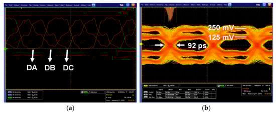 Figure 16a shows the pre-determined data transmitted from the MIPI C-PHY transmitter chip for the proposed adaptive level-dependent equalization. The measured waveforms had a symbol rate of 2.5 Gsymbol/s/lane and the same pattern of the pre-determined data shown in Figure 4. Figure 16b shows the differential output eye diagram of the MIPI C-PHY transmitter for evaluation of the MIPI C-PHY receiver chip. The MIPI C-PHY transmitter was operated at a symbol rate of 3 Gsymbol/s/lane when its supply was 500 mV on a four-inch FR-4 printed circuit board. The transmitted data had a peak-to-peak time jitter of 92 ps at the zero crossing point.