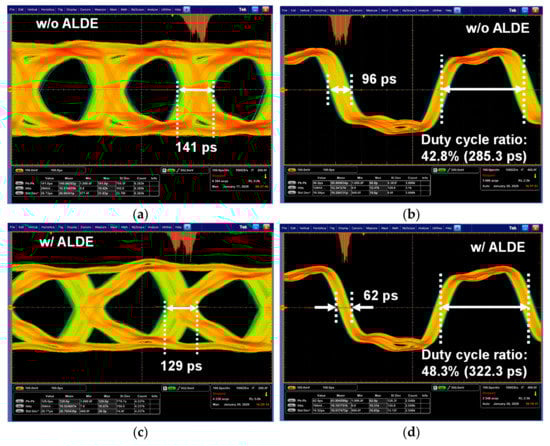Measured eye diagrams of received data and recovered clock: (a) Received data without ALDE; (b) Recovered clock without ALDE; (c) Received data with ALDE; (d) Recovered clock without ALDE.