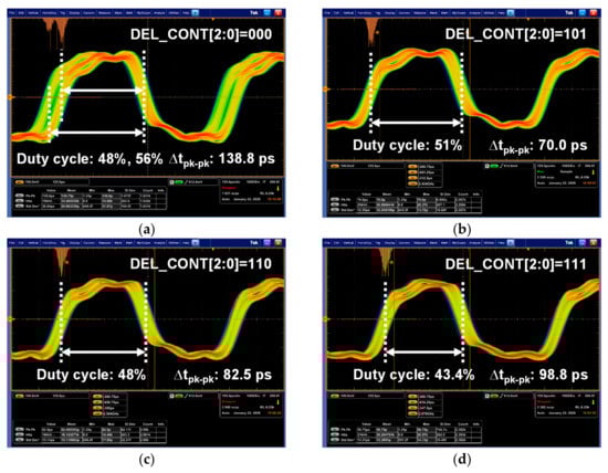 Figure 18 shows the performances of the recovered clock measured according to the digital control code for the ALDE, DEL_CONT[2:0]. These measurements were performed at a symbol rate of 2.5 Gsymbol/s/lane. When the DEL_CONT[2:0] was 3b’000, the recovered clock had a bimodal distribution and a duty cycle ratio ranging from 48% to 56%, as shown in Figure 18a. Due to this, it had a large peak-to-peak time jitter of 138.8ps. As the DEL_CONT[2:0] increased, the recovered clock had a normal Gaussian distribution, and its duty cycle ratio and time jitter were improved, as shown in Figure 18a–c. The proposed ALDE optimized the performance of the recovered clock by setting the DEL_CONT[2:0] to 3b’101. Table 1 shows that the proposed receiver chip fully supports the MIPI C-PHY V1.1 specification with performances comparable to previous studies.