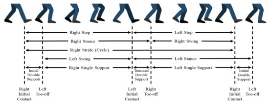 Gait analysis is used to assess and treat individuals with conditions affecting their ability to walk, such as poor health, advanced age, size, weight, and speed. A standard assessment is needed to clinically identify and evaluate gait characteristics and other phenomena in PD patients, such as gait count, walking speed, and step length. Pistacchi et al. analyzed temporal parameters (see Figure 1) in patients with early PD using 3D gait analysis-related cadence (PD patients: 102.46 ± 13.17 steps/min and healthy subjects: 113.84 ± 4.30 steps/min), stride duration (PD patients: 1.19 ± 0.18 s right limb and 1.19 ± 0.19 s left limb; healthy subjects: 0.426 ± 0.16 s right limb and 0.429 ± 0.23 s left limb), stance duration (PD patients: 0.74 ± 0.14 s right limb and 0.74 ± 0.16 s left limb; healthy subjects: 1.34 ± 1.1 s right limb and 0.83 ± 0.6 s left limb), and velocity (PD patients: 0.082 ± 0.29 m/s; healthy subjects: 1.33 ± 0.06 m/s) [5]. Sofuwa et al. concluded that individuals with PD showed a significant reduction in step length and walking speed compared with the non-PD control group [6]. These observations suggest that foot force is affected by PD. Lescano et al. aimed to analyze gait parameters, stance, swing phase duration, and the magnitude of the vertical component of the ground reaction force for the purpose of assessing whether there are statistically significant differences between PD patients in stages 2 and 2.5 (modified Hoehn and Yahr (HY) scale, see description in Table 1) [7]. Gait information has been developed for movement analysis in healthy control (CO, term defined by PhysioNet [8]) subjects and other subjects with different types of diseases. This approach is useful for understanding movement disorders arising from PD, and may be valuable in developing non-invasive automatic detection and severity classification approaches for PD.