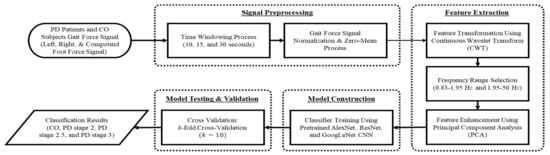The proposed PD severity classification algorithm attempts to extract pattern features and visualizations from vGRF signals in PD patients with severity stages of 0, 2, 2.5, and 3 on the HY rating scale by transforming one-dimensional time domain signals into two-dimensional patterns (images) using the feature transformation method from a CWT. The proposed PD severity classification algorithm consists of four main steps, as shown in Figure 2: (1) signal preprocessing of PD patients’ vGRF signals, (2) feature extraction from a spectrogram of the vGRF signal generated using CWT and PCA, (3) construction and training of a CNN classifier, and (4) cross-validation to evaluate the performance of the classification algorithm.