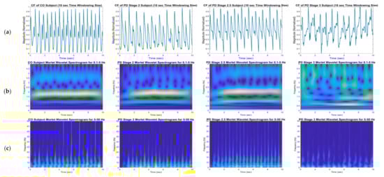 Time-frequency spectrograms using CWT of the first 10 s CF vGRF signals of CO, PD Stage 2, PD Stage 2.5, and PD Stage 3 subjects in a 10 s time window size from Ga [21] dataset: (a) original vGRF signal, (b) 0.1–5 Hz time-frequency spectrogram, and (c) 5–50 Hz time-frequency spectrogram.