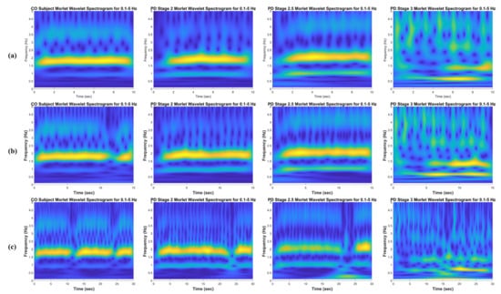 Time-frequency spectrograms using CWT of the CF vGRF signals of CO, PD Stage 2, PD Stage 2.5, and PD Stage 3 subjects in the 0.1–5 Hz frequency range for (a) a 10 s time window size, (b) a 15 s time window size, and (c) a 30 s time window size from Ga [21] dataset.