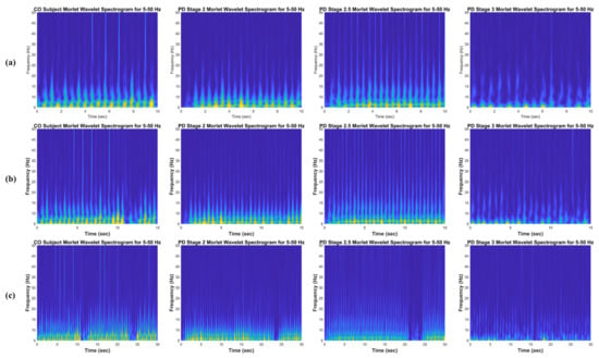 In this section, we discuss the gait analysis for each severity stage of PD based on the time and frequency analyses of the time–frequency spectrograms. Some key features of a signal are difficult to observe with the naked eye, but time–frequency spectrogram analysis can help to decipher important information regarding time and frequency characteristics. A CWT was used in this study to transform the signal from the time domain into the time–frequency domain. The gait phenomena could be identified using pattern visualization and recognition based on time–frequency spectrograms for CO subjects and PD patients with severity stages of 2, 2.5, and 3.