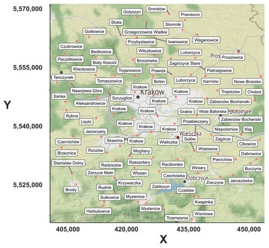Measurements of PM1, PM2.5, and PM10 from 90 optical Airly PM Sensors were used. Figure 1 shows the locations of the sensors used in this research. The receivers were selected to cover both the city of Krakow and its surroundings. Airly sensors are one of the most popular in the Krakow area and can provide a high density of spatial data []. As a result of their convenience and relatively low price, they are also gaining popularity throughout the country [,] and around the world []. Airly sensors for PM measurements are optical sensors that measure light scattering. The accuracy of the results from such devices is strongly related to the physical properties of the particles, which can vary depending on location and season []. The manufacturer of Airly sensor states that the PM1 measurement range is 0–500 µg/m3 (5 µg/m3 accuracy in the range 0–100 µg/m3 and 10 µg/m3 in the range 101–500 µg/m3), and the PM2.5 and PM10 measurement range is 0–1000 µg/m3 (10 µg/m3 accuracy in the range 0–100 µg/m3, 10% in the range 101–500 µg/m3, and 20% in the range 501–1000 µg/m3). Aside from PM concentrations, the basic Airly sensor measures pressure in hPa (in the range 700–1200 hPa, with an accuracy of 1 hPa), the temperature in °C (in the range −40–80 °C, with an accuracy of 0.5 °C), and the humidity (in the range 0–100%, with an accuracy of 3%). The smallest measurement interval is 5 minutes. The samples are sent to the database via GSM protocol and are available from the Airly website or API. Sensors can use a solar power supply [].
