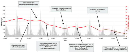 Krakow’s PM2.5 concentration (grey) and its STL trend (red) in the years 2010–2019 together with major law changes and grassroots action.
