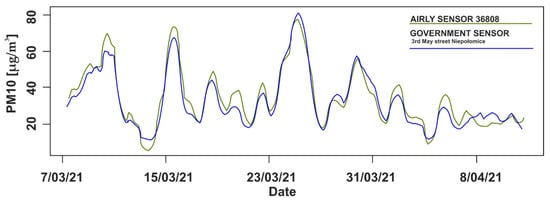 From all 90 sensors, sensor 36808 in Niepołomice was the closest to a government sensor. The government station is located on 3 May Street in Niepołomice (SE part of the investigated area). Table 3 shows statistics for the calculated time-series difference between 24-h averaged measurements of PM10 from government stations (GOV) and the Airly sensor in Niepołomice. The correlation coefficient for these measurements between 7 March and 16 April 2021 was 0.93. A comparison between the 24-h averaged measurements of Airly sensor 36808 and the government sensor located on 3 May street is shown in Figure 3.
