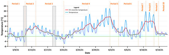 The temperature in Krakow between the 7th of March and 16th April (blue) and the temperature STL trend (red). The green line indicates zero Celsius degree point; grey boxes are days chosen for the inflow and outflow study. Orange marks represent 10 different temperature periods.