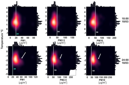 Figure 4 shows the temperature measurements from 7 March to 16 April 2021 together with the STL trend. Our aim was to show the inflow and outflow of air pollution in Krakow. To indicate the proper time and date, it was necessary to deeply study the temperature changes, as this is one of the main factors affecting whether people heat their households or not. It was possible to designate 10 temperature intervals: the first was the 7 to 10 March, which was stable at around 0 °C; the second was from the 11 to 14 March, during which the average temperature trend increase was visible; the next was a slowly decreasing period from 14 to 21 March, at the end of which the temperature reached its minimum value; the 4th period was up until the 2 April, when temperature stably increased (excepting a 1-day trend break); the next period was from the 2 to 5 April, wherein the temperature decreased to around 1–2 °C and stabilized on this value for 5 days; then, there were four three-day periods, in which the temperature first rose, then stabilized, before dropping again, and stabilizing once more in the last period. The 11th of March was chosen to study the effect of the air pollution outflow, and the 18th of March was chosen to study the effect of the air pollution inflow. Firstly, those days were characterized by an upward or downward temperature trend. Secondly, according to the relationship between the Predicted Mean Vote (PMV) and Perceived Temperature (PT) indicator in the study by Jendritzky et al. [], it was shown that most people classified temperature between 0 and 20 °C as comfortable, and when the temperature decreases below 0 °C, most people classify it as cold. Figure 5 shows the increase in PM concentrations when the temperature dropped below the aforementioned comfortable temperature. In the first-row kernel density estimate plots for PM1, PM2.5, and PM10 versus temperature from the 18th of March, 18:00 was plotted. The second row contains the same plots but from 24:00. At 18:00, the temperature was above zero, and for all temperature points, the distribution of PM was similar. At 24:00, the distortion in the distribution symmetry is visible. White arrows indicate the increase in PM in the air. This is in clear accordance with the PMV and PT study.
