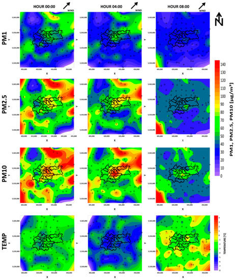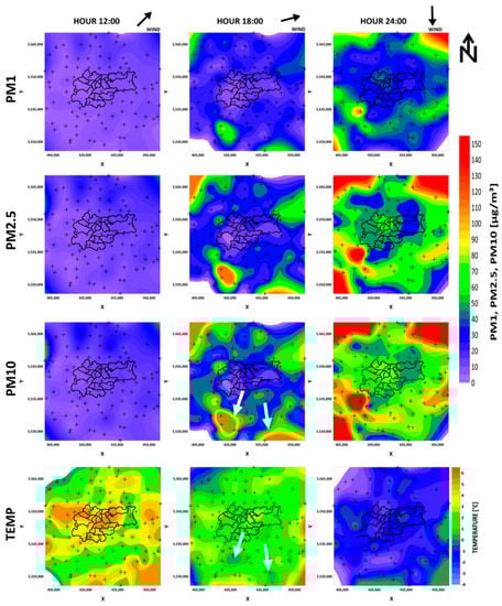 Temperature maps of air pollutions entering (PM1, PM2.5, PM10) Krakow on 18 March 2020. White arrows indicate areas in which the temperature was below the comfort zone.