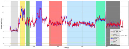To objectively evaluate the final solution’s performance, the model was trained a total of 15 times, changing each time the participant constituting the test set. For a full evaluation of the proposed architecture, a PPG signal and a 3-axis accelerometer signal measured by a wrist-worn device were used. The HR predictions obtained for each participant were subjected to performance metrics and thus, for the entire collection protocol, individual participants obtained the following scores as shown in Table 7. The lowest errors are apparent for physical activities that do not require increased intensive movement, such as sitting, driving, lunch, or work. For these activities, the model obtains sufficiently good results that do not require significant improvements. Worse results are noticeable for all activities requiring dynamic movement. The most difficult activities for which the model had to predict HR were climbing stairs, table soccer, cycling, and walking. The movement aspects of these activities significantly worsen the readings from the sensors mounted in the wristband. Despite this, for a large number of participants, the predictions for these activities were not a problem for the network used. An example of these are participants S13, S14, and S15, for whom accurate predicted HR results were acquired for almost every activity. The negative movement aspect is most evident for participant S5, as his results for the low movement activities are comparable to the rest of the participants. However, when the model was tasked with predicting HR for this participant during more intensive activities, his performance worsened significantly. In the case of this participant, the disturbed sensor readings were further compounded by tachycardia.