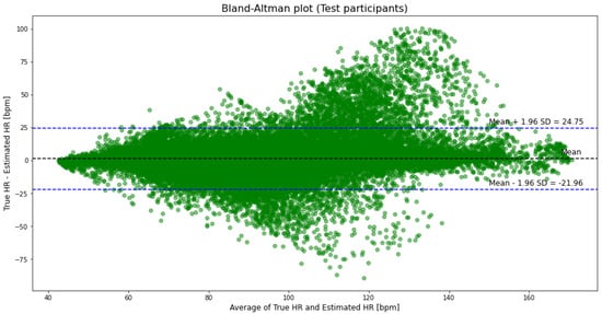 Bland–Altman plot for all participants from PPG-DaLiA dataset. Analysis for all 64,697 HR estimated values, with 3544 (5.48%) points outside the limits of agreement.