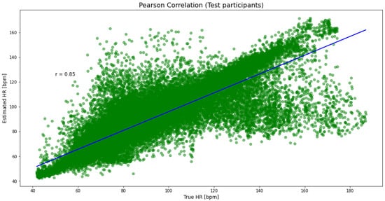 An example of a detailed prediction obtained with the proposed model is shown for participant S7 in Figure 1. Figure 2 presents a Bland–Altman analysis for all participants from the PPG-DaLiA dataset. Pearson’s correlation coefficient is 0.85 (Figure 3) and the p-value is <0.05.
