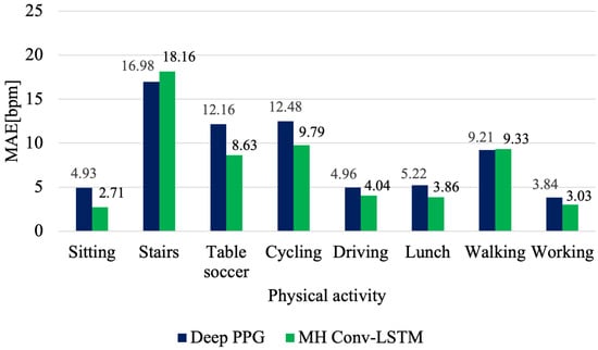 In the presented solution, the average errors have been improved for the vast majority of activities. The only activities with worse MAE values were climbing stairs and walking. For activities with more dynamic movement, particular improvement is evident for table soccer and cycling, which improved errors by 3.53 bpm and 2.69 bpm, respectively. However, considering the overall model performance, the solution proposed in this work achieves better results (Figure 4).