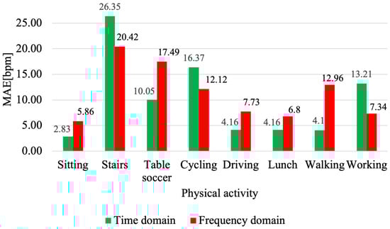 The model was only tested for participants S3, S5, S9, S12, and S15, and the results for these participants show that using the frequency domain gives worse results. Despite this, Figure 5 shows the average MAE results for given participants performing each protocol activity. The frequency domain was found to be better for climbing stairs by 5.93 bpm, cycling by 7.44 bpm, and for work by 5.87 bpm. The results obtained partially explain the comparison with the Deep PPG solution (Figure 5), as the authors also used data in the frequency domain, and as in the Deep PPG solution, climbing stairs is better predicted for this domain in this comparison. The reason for this may be that the time–frequency spectrum focuses on the periodicity of the signals, especially during climbing stairs.