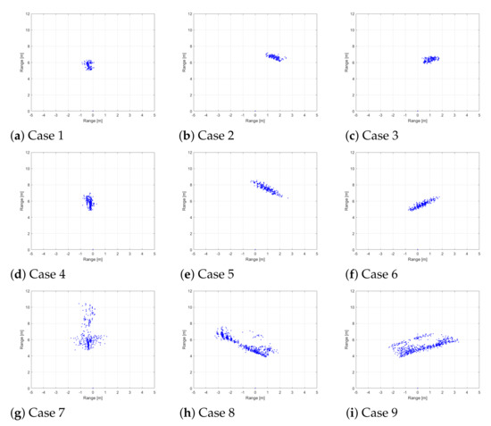 Figure 5 shows the accumulated radar detection results for 0.75 s for a pedestrian, a cyclist, and a car, respectively. As shown in the figure, each target is detected as a number of points because the range resolution of our radar sensor is in units of several centimeters. From a pedestrian to a car, each target is detected as more points because the physical size of the target increases. In addition, the movement information of the target is reflected in the accumulated detection result.