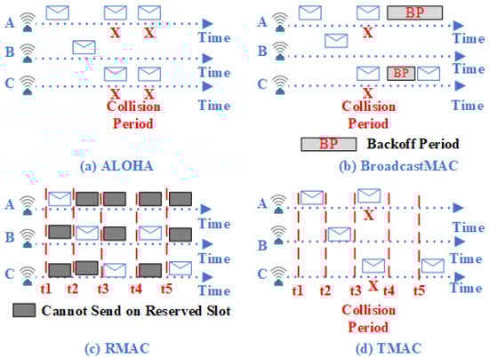 BroadcastMAC [39] is a contention-based random-access protocol that uses CSMA/CA, where a sensor node can transmit packets if the channel sensed is free, otherwise it backs-off. This protocol resolves the issue of Aloha by sensing the channel prior to transmitting packets, and therefore reducing the number of collisions and improving network performance. However, hidden-terminal, spatio-temporal uncertainty, and near-far problems can still exist.