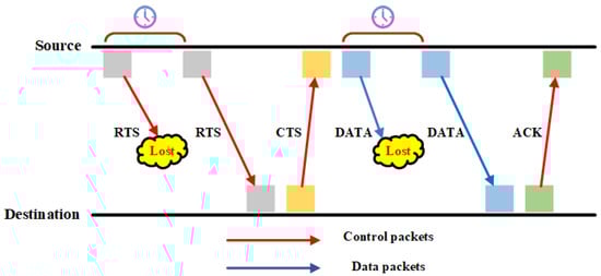 Due to the characteristics of acoustic channel, packets can be lost and must be retransmitted. When packets are lost in S-FAMA [43], M-FAMA [45,46], MACA-APT [28], MACA-PC [35], and OPMAC [47], the source must retransmit the lost packets via any data channel as illustrated in Figure 3. This process increases the end-to-end delay. To reduce the time taken to retransmit lost packets, Kim and Cho [48] proposed a cooperative Automatic Repeat Request MAC (ARQ-MAC) protocol. This protocol introduces one control packet to define the cooperators between source and destination. Furthermore, to transmit packets, a node first sends RTS to the destination. Then, nodes overhearing the RTS packet send a reply with a Request-To-Cooperate (RTC). The source selects the best cooperators based on the shortest path. Once the source receives the CTS packet from the destination, the source transmits data through the preferred cooperators. The great advantage of this protocol is that if packets are lost or an incorrect packet is received, the destination requests retransmission from the closest cooperator. Furthermore, to request retransmission from a cooperator, the destination sends a Negative ACKnowledgment (NACK) to the closest cooperator. If the destination fails to receive the missing packets from that closest cooperator, it then sends NACK to the next closest cooperator, and so on, until it receives the missing packets. This technique improves network throughput, reduces energy consumption, and ultimately reduces the end-to-end delay. However, end-to-end delay and network throughput would be further improved if ARQ-MAC avoided collisions to control and data packets and allowed concurrent transmissions simultaneously. Since ARQ-MAC allows only a single node to reserve a shared channel, this results in low EE and high COR by consuming more energy to transmit control packets. Moreover, ARQ-MAC must rely on the 3-D network architecture to minimize the amount of power that is required to transmit collected data between intended parties.
