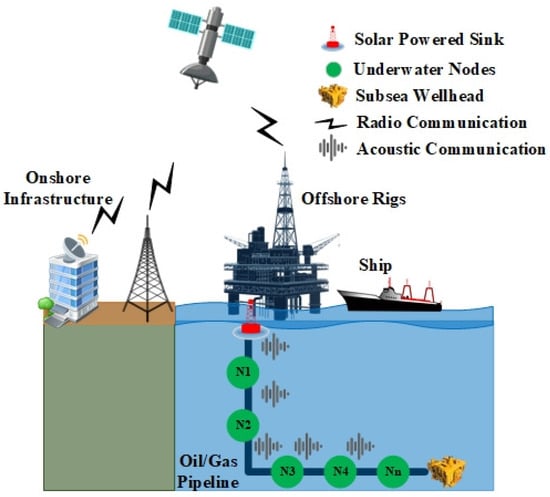 In this study, we focus on monitoring oil/gas underwater pipeline in shallow water. The underwater network is deployed with 3-D network architecture, where numbers of underwater nodes are laid at different depths and a single sink node is placed at the water’s surface. The underwater network is broken down into onshore infrastructure and offshore infrastructure. The offshore infrastructure consists of sensor nodes, a sink node, offshore rigs, and a ship. In contrast, the onshore infrastructure consists of the data center, where collected data can be monitored, as well as a refinery. The operation of the oil/gas industry is divided into three sectors, which are: upstream, midstream, and downstream [63,64]. The main objective of the upstream sector is to search for areas where oil/gas materials may exist and then extract them. Once the raw materials have been extracted, they must be stored and then moved to a refinery. The midstream sector is responsible for the storage and transport of the raw materials. After the raw materials have been processed in a refinery, they are considered converted into a product. Turning the raw materials into a product is the responsibility of the downstream sector. The oil/gas industry uses offshore rigs to look for raw materials and extract them. In this study, we focus on monitoring this upstream sector by deploying underwater sensors at different depths and a single sink node at the surface level. Oil tankers have barrels to store raw materials and transport them to a refinery. The refinery is the onshore infrastructure that represents the downstream sector.