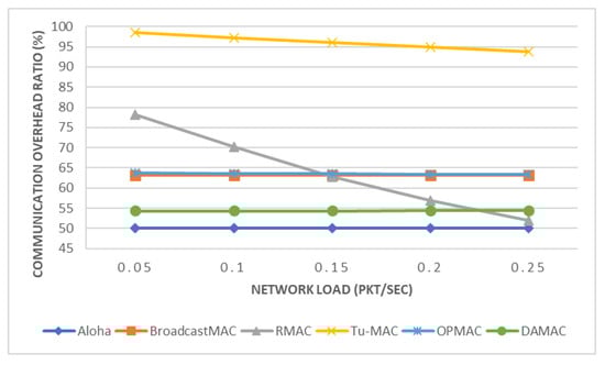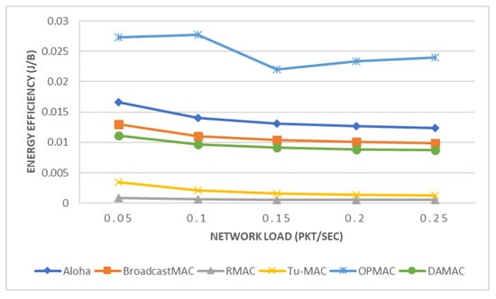 In Figure 5, the EE of Aloha [39], BroadcastMAC [39], RMAC [40], T-MAC [39], OPMAC [47], and DAMAC protocols is inversely proportionate to the network load. This means that as we increase the network load, lower energy consumption per byte and hence researchers are recommended to use higher network load to improve EE. Aloha, BroadcastMAC, and DAMAC protocols offer much higher EE compared to RMAC, T-MAC, and OPMAC protocols, due to their higher PDR. Moreover, the DAMAC protocol offers better EE compared to the Aloha, BroadcastMAC, and OPMAC protocols due to its being schedule-based. In particular, the DAMAC protocol achieves higher EE by 29–33%, 12–14%, and 59–65% compared to Aloha, BroadcastMAC, and OPMAC protocols, respectively. This means that DAMAC consumes lower energy per byte and hence can better extend network lifetime in comparison with the Aloha, BroadcastMAC, and OPMAC protocols. In contrast, the DAMAC protocol offers lower EE by 1160–1612% and 220–608% compared to the RMAC and T-MAC protocols, respectively. The main reason for this is that DAMAC protocol receives a much higher number of bytes compared to both the RMAC and T-MAC protocols. This means that DAMAC consumes a higher amount of energy per byte relative to the RMAC and T-MAC protocols at the cost of increased PDR. Based on the above results, the DAMAC protocol provides higher EE as compared to Aloha, BroadcastMAC, and OPMAC while resulting in lower EE when compared to the RMAC and T-MAC protocols. This means that DAMAC protocol outperforms contention-based MAC protocols, but that contention-free and hybrid MAC protocols can offer the highest EE but one that comes at the cost of low PDR.