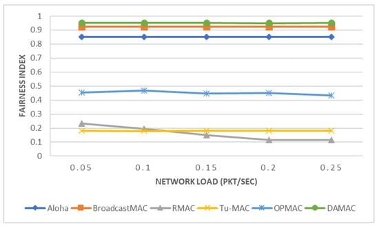 In Figure 7, we observe that the fairness of the network of the Aloha [39], BroadcastMAC [39], T-MAC [39], and DAMAC protocols is constant to the network load. This means that underwater nodes will have the same opportunity to access the channel and transmit collected data regardless of the network load. In these types of protocols, it is highly recommended to use a high network load to achieve lower COR and EE. In contrast, the fairness of the network of RMAC [40] protocol is inversely proportionate to the network load. This means that when using the RMAC protocol, some underwater nodes will have less opportunity than other nodes as the network load increases. Consequently, it is likely that an underwater node would not be able to transmit critical data during a disaster due to the operation of the RMAC protocol, which could hence increase the severity of total loss. Therefore, it is critical that a MAC protocol share network resources more efficiently to alert operators with minimal delay in case of incidents of disaster. The fairness of the network of OPMAC [47] protocol varies based on the given network load. Aloha, BroadcastMAC, and DAMAC protocols offer much higher fairness of the network compared to the RMAC, T-MAC, and OPMAC protocols. This indicates that the Aloha, BroadcastMAC, and DAMAC protocols share network resources more fairly among the nodes compared to the RMAC and T-MAC protocols. This is because of the competition to access the channel by exchanging control packets, which lowers the fairness. DAMAC protocol achieves the highest fairness of the network compared to other MAC protocols due to the schedule-based algorithm. This means that the DAMAC protocol can support oil/gas pipeline monitoring applications more efficiently in comparison to other well-known MAC protocols. In particular, DAMAC protocol outperforms Aloha, BroadcastMAC, RMAC, T-MAC, and OPMAC protocols by about 12%, 3%, 307–726%, 429–430%, and 103–120%, respectively. Based on the above results, the Aloha, BroadcastMAC, and DAMAC protocols are more appropriate to support time-sensitive applications than the RMAC, T-MAC, and OPMAC protocols.
