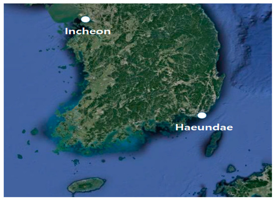 Data from two sites were used: Incheon port and Haeundae beach. The observation data were obtained from the Korean Metrological Administration (KMA) and Korea Hydrographic and Oceanographic Agency (KHOA). Incheon is a strategic port in the west of the Korean Peninsula facing the Yellow Sea, while Haeundae beach is popular in the southeast of the peninsula (Figure 1).