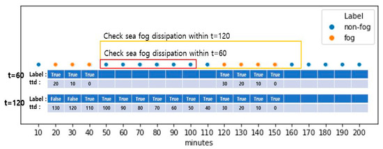 Formally, given a prediction time period representing 10-min intervals in 60, 120, or 180 min, a grouped fog period , which consists of fog cases within the prediction time proximity from each other, is labelled as