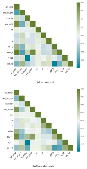 There were other correlations, both positive and negative, among the rest of the features in both Incheon port and Haeundae beach. Despite these highly correlated features, due to the low count of the number of features available, all of them were included in the training. Therefore, we could not choose a linear model as a learning model. The list of base seven features was extended with derived features, such as air and sea temperature difference and dew point temperature, for the same reason. Overall, as weather conditions are highly dependent on each other, the observed correlation is inevitable.