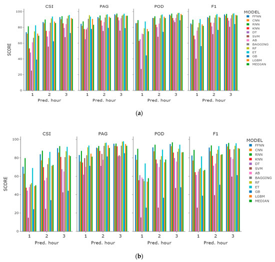 When modeled as a classification task, the models showed performance that is consistent over the prediction times of one, two, and three hours, as shown in Table 4, Table 5 and Table 6, respectively. As the prediction time is extended, the prediction of dissipation (occurrences) becomes more accurate. Another dimension along which improvement is achieved is the past time steps—more features resulted in better accuracy for all models. The accuracy was higher for three-hour features as compared with the one-hour ones. The performance of the models over the prediction periods was averaged and ranked. The rankings derived in this way demonstrate relative consistency when compared to the number of past time steps.