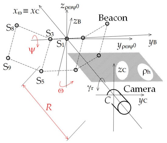 The above equations were derived assuming that the yB beacon axis and yC camera axis are parallel to the horizontal plane ρh (see Figure 2). Their mutual roll angle γr, which is created by the beacon or the camera rotation around the camera optical axis, was considered to be zero. The variables expressed with (2) to (5) are the functional distances Ri1 for diodes Si, where i = 3, 5, 8, 9, and reference diode S1. They are the beacon distances computed from the projections of the distances PSi (between the reference diode S1 and the functional diodes) onto the individual axes of the reference rectangular coordinate system and from the projections of the image distances bi1 of these diodes onto transverse axes yC and zC of the camera coordinate system CxCyCzC. The reference coordinate system is parallel with the camera coordinate system. The axis xω of the reference coordinate system and the axis xC of the camera coordinate system are identical with the camera optical axis. The origin of the reference system is at the intersection of the axis xω and the beacon front wall Af (in the place of the reference diode S1); the axes yρωψ0 and zρωψ0 lie in the plane ρωψ0, which is identical with the beacon front wall Af for ω = ψ = 0°. In this case, yρωψ0 ≡ yB and zρωψ0 ≡ zB. The azimuth and the elevation are formed by the beacon rotation around the axis zρωψ0 and yB, respectively. Parameters d16 and α1 are derived from the beacon base b and the beacon opening angle β (see Figure 1). The working equations for the rest of the functional diodes are performed analogically. The elements PSixω are corrections of the deviation between the object distances of the functional diodes and the measured beacon distance.