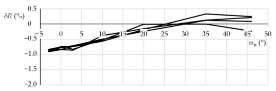The first experiment was performed using a lens with a focal length fL = 120 mm. The beacon distance R0 was 46,520 mm. The nominal azimuth ωn (°) and elevation ψn (°) were {−3, 0, 3, 10, 20, 35, 46} and {0, 5, 20, 35}, respectively. For the individual nominal elevations, the azimuths were set around their nominal values and the beacon image was recorded. Five test series were performed for every elevation. Obtained results were used for statistical processing of errors. The second and third tests were performed with the same beacon, however, using a lens with a focal length fL = 25 mm. The beacon distances were 13,460 and 46,728 mm, respectively. The setup of these tests was the same as for the first test. One hundred forty photos were taken for each distance and focal length; in total, 420 photos were taken. Table 1 shows examples of distance Rm, azimuth ωm, and elevation ψm that were measured during the first experiment in the first and second test series, for the nominal elevation of 20°. For comparison, the conventionally true values R0, ω0, and ψ0 are also shown. Figure 4, Figure 5 and Figure 6 show the distance percentage errors δR and the position angles errors Δω and Δψ for the same test and in all the five test series.