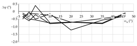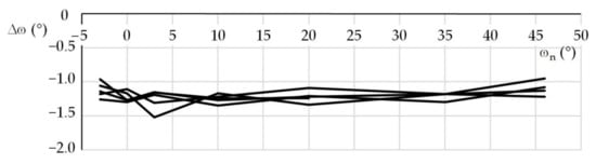 Adjustment of the mathematical model, by entering the beacon opening angle βM into the model (hereinafter model opening angle), consists of position angle error evaluation for different angles βM. As an example, Table 10 shows the results for several angles βM and two combinations of nominal azimuth and elevation, [ωn; ψn] (°). These combinations were [0; 20] and [20; 20]. Results from the first series of the first experiment were used; the beacon distance and lens focal length were 46,820 and 120 mm, respectively.