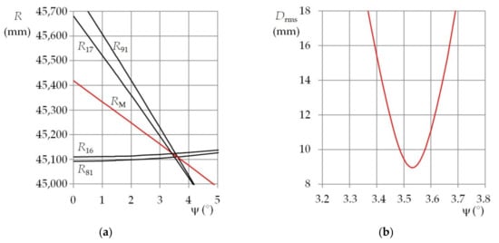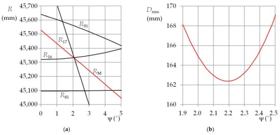 (a) Plots of the functional distances for diodes S6, S7, S8, and S9; (b) root mean square of the distance deviations for diodes S6, S7, S8, and S9; R0 = 46,820 mm, fL = 120 mm, ωn = 20°, ψn = 0°.