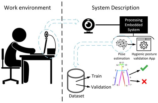 In addition, there are some works, developed in recent years, that are focused on the detection of the user’s skeleton through video processing [33,34]. These works usually use DL-based processing techniques with convolutional neural networks (CNN) to estimate the situation of the user’s various joints. With these previous works, it is feasible to design a skeleton detection and tracking system using CNN and, with this information, to design a recommendation system, aiming for the proper posture of the worker in front of the computer. However, video processing using CNNs requires significant computational resources to provide a real-time response. It would be much more comfortable and transparent for the worker if the system was integrated in the monitor (both the vision sensor and the processing system).